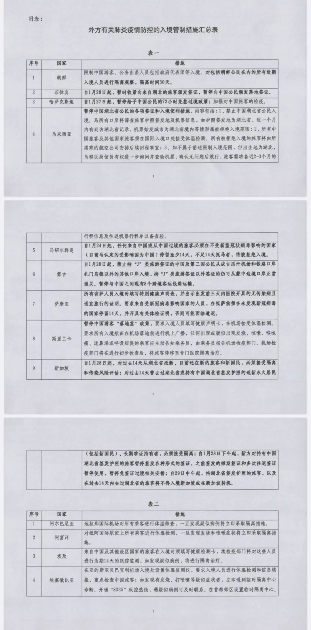 为防控新型冠状病毒感染的肺炎疫情,部分国家已在口岸采取了相应的入境管制措施(详见附表,供参考)。外交部领事司提醒中国公民根据自身健康状况合理安排出行,详细了解并遵守目的地国有关入境规定。