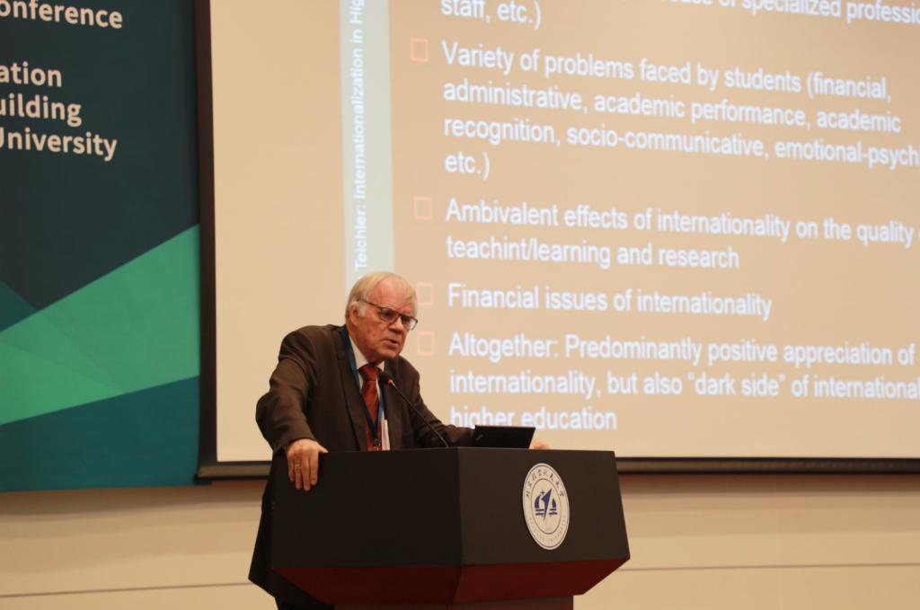 随后的全体会议环节由人文社会科学学院高等教育研究院副院长雷庆教授主持。Teichler教授作了题为Internationalization in Higher Education: Common Challenges? Varied Conditions? Varied Solutions的主旨报告。Teichler教授回顾了高等教育领域围绕国际化这一主题开展的主要研究,梳理了高等教育国际化中知识转移、人员流动、跨境合作、本土国际化等不同模式,分析了高等教育国际化在世界各地的不同理念与机制,肯定了国际化对促进高等教育人才培养、推动大学建设的重要作用,并对未来高等教育国际化研究和实践提出了建议。