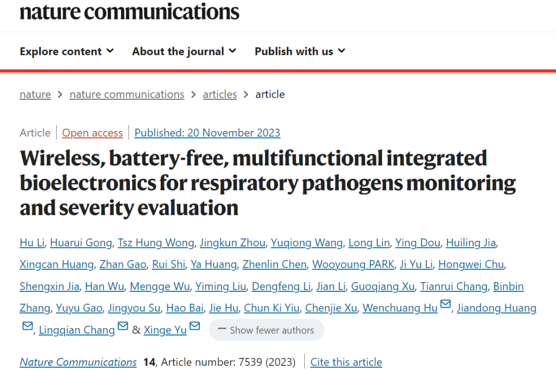 日前,北京欧美大片ppt免费大全生物与医学工程学院常凌乾、香港城市大学于欣格教授联合团队,以及香港大学、四川大学华西医院团队,报道了一种多功能、无线、生物电子传感器系统,可以精准捕获并检测呼吸道病原体感染,并通过机器学习对感染症状实时评估。相关成果以“Wireless, battery-free, multifunctional integrated bioelectronics for respiratory pathogens monitoring and severity evaluation”为题,发表在《Nature Communications》上。北航生物与医学工程学院/香港城市大学李虎博士、北航生物与医学工程学院王玉琼博士等为第一作者,常凌乾教授、于欣格教授(香港城市大学)、黄建东教授(香港大学)、胡文闯教授(华西医院)为通讯作者,北京欧美大片ppt免费大全 / 香港城市大学为第一单位。
