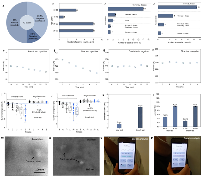 图2:通过呼吸和吹气测试实现阳性及阴性志愿者的快速准确识别