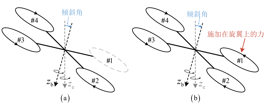 四旋翼飞行器的任一旋翼失效,将直接导致飞行器受力不平衡,无法保持安全飞行姿态。以往的解决方法是预先计算不同旋翼故障的平衡点,据此进行不同的控制,这要求针对不同情况进行单独设计,并且需要在不同的情况下切换不同的控制器。但是实际生活中四旋翼飞行器可能遇到的执行机构故障多种多样,难以穷尽,针对每一种故障情形设计不同的控制策略是不现实的。