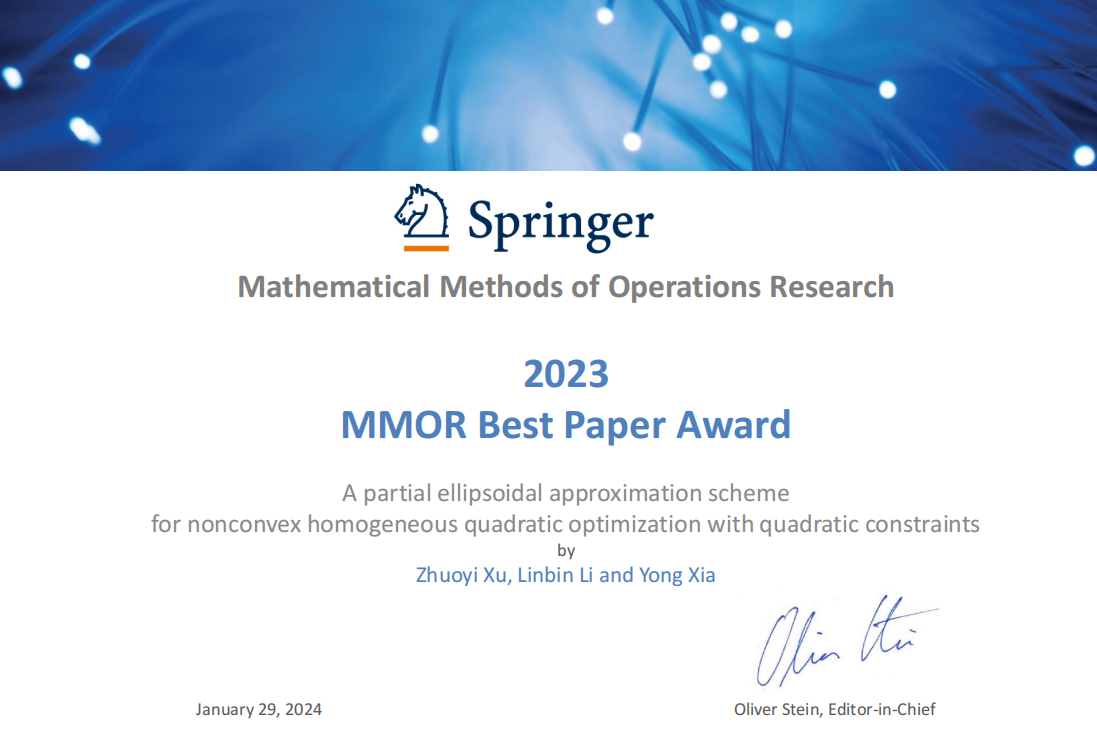 1月29日,德国老牌运筹学期刊Mathematical Methods of Operations Research(MMOR)发布了2023年最佳论文奖,数学科学学院夏勇教授团队凭借论文《A partial ellipsoidal approximation scheme for nonconvex homogeneous quadratic optimization with quadratic constraints》获得奖项。MMOR创刊于1956年,侧重运筹学(特别是连续与离散优化、随机、博弈论)的数学与计算,由Springer出版,2022年影响因子为1.2,MMOR自2020年起设年度最佳论文奖,颁给上年度最佳论文(每年一篇)。本次最佳论文奖首次颁给亚洲作者。