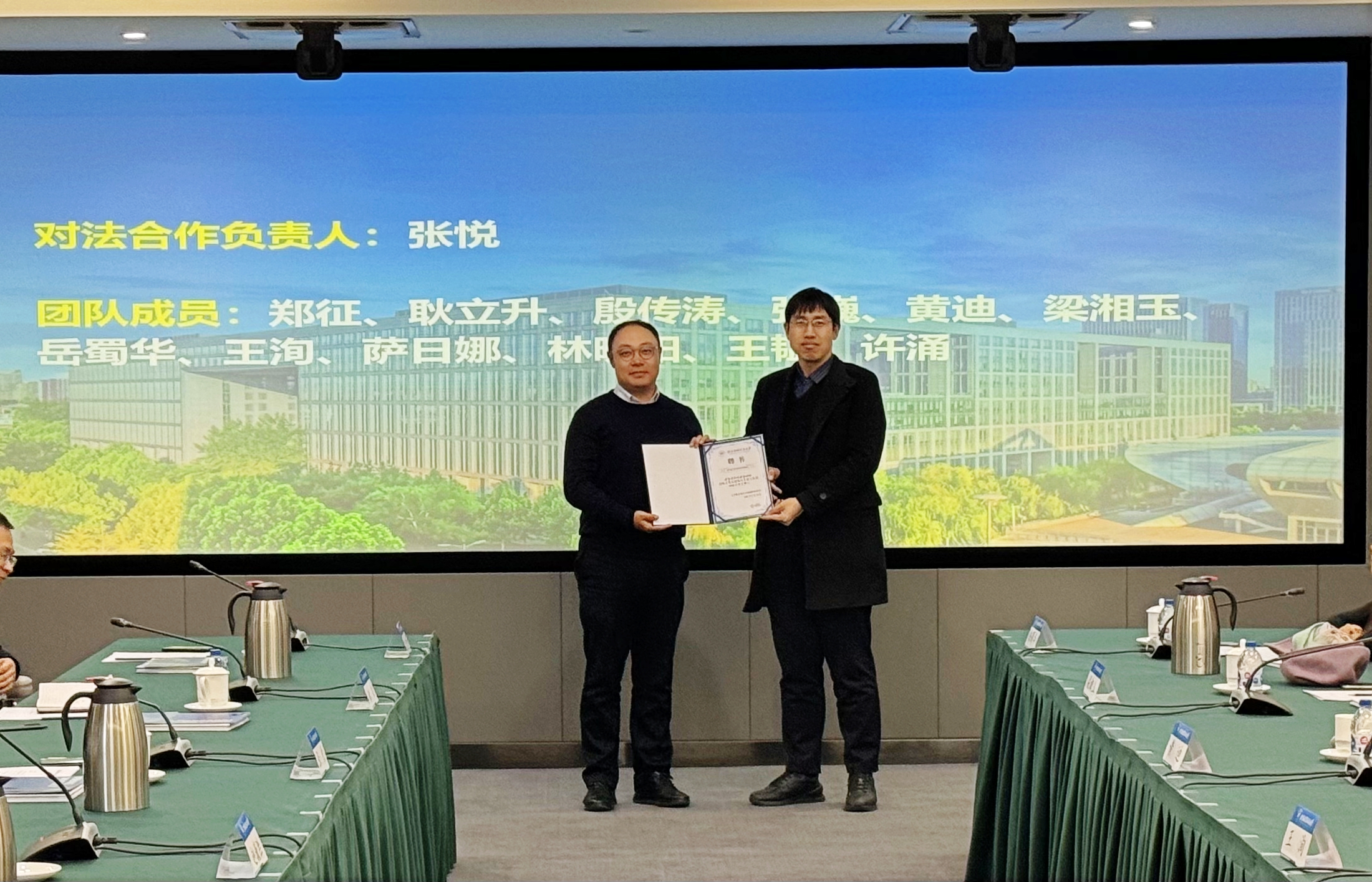 启动仪式上,赵巍胜向对法合作负责人、集成电路学院常务副院长张悦,对日合作负责人、化学学院院长刘明杰颁发聘书。