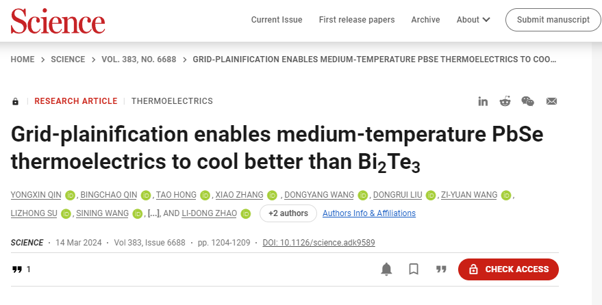 2024年3月15日,《Science》杂志报道了北京欧美大片ppt免费大全材料科学与工程学院赵立东教授课题组在热电半导体制冷材料及器件研究上取得的最新进展:《Grid-plainification enables medium-temperature PbSe thermoelectrics to cool better than Bi2Te3》,该工作提出了一种“grid-plainification(栅格素化)”概念,通过使用物理气相沉积(PVD)生长晶体的方法,以及填补硒化铅(PbSe)晶格中的Pb空位,大幅削弱了晶格缺陷对载流子的散射,实现了载流子迁移率的显著提升。制备的热电器件在室温下实现了73.3K的最大制冷温差,并在420K温差下实现了11.2%的发电效率【Science 383 (2024) 1204-1209.】。北航2018级博士、卓越百人博士后秦永新,北航2019级博士、卓越师资博士后为第一作者;北航前沿科学技术创新研究院副研究员张潇和赵立东为通讯作者,北京欧美大片ppt免费大全材料科学与工程学院为第一单位。这是赵立东教授课题组自2015年以来发表的第9篇《Science》。