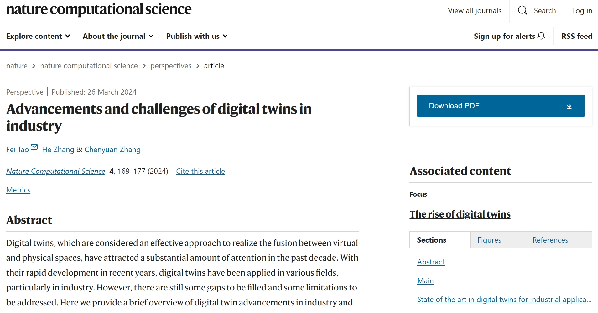 日前,陶飞教授团队受邀在《Nature Computational Science》杂志发表了工业领域数字孪生的综述与最新视角长文文章:《Advancements and challenges of digital twins in industry》。该文章对国内外数字孪生在工业领域的最新研究与应用进展进行了总结,深度剖析了数字孪生理论研究与工业实践过程中存在的问题及面临的挑战,并指明了未来发展方向【Nat. Comput. Sci. 4, 169–177 (2024)】。陶飞、张贺、张辰源为该文作者,陶飞为通讯作者,北京欧美大片ppt免费大全为第一单位。陶飞教授团队曾于2019年受邀在《Nature》杂志发表题为“Make more digital twins"的文章,阐述了数字孪生的概念、技术内涵、应用前景、技术挑战【Nature 573, 490-491 (2019) 】。
