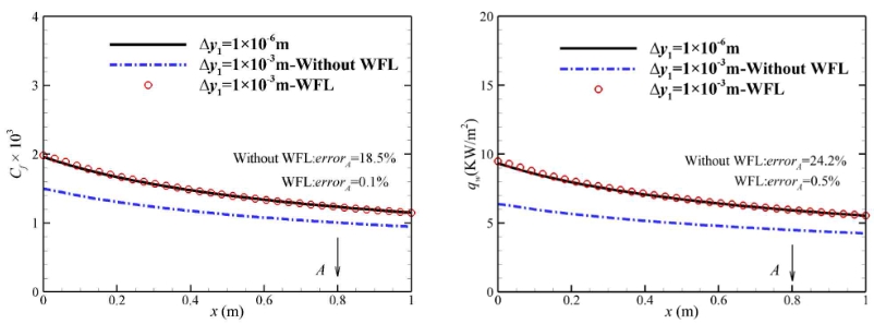 图2 壁函数方法在稀网格下对数值模拟精度的提升效果:摩擦系数(左);热流密度(右)
