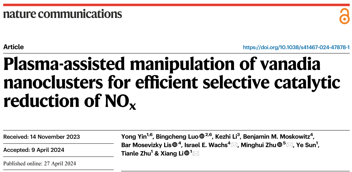 近日,能源与动力工程学院李想副教授团队与合作者在固定源烟气污染物控制领域取得重要进展,相关研究成果以“Plasma-assisted manipulation of vanadia nanoclusters for efficient selective catalytic reduction of NOx”为题在线发表于《Nature Communications》(《自然·通讯》)期刊。