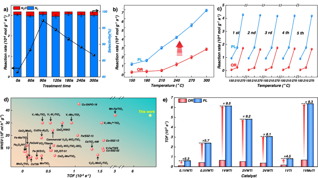 李想团队利用简单的H2低温等离子体处理商用V2O5–WO3/TiO2脱硝催化剂,实现了单分散钒氧位点向亚纳米钒氧团簇的秒级转化,在高空速条件下(375,000 cm3/(g·h)), NO转化频率提升了9.5倍,并且该方法可拓展至V2O5/TiO2、V2O5–MoO3/TiO2等多个各类钒系脱硝催化体系(见图1)。