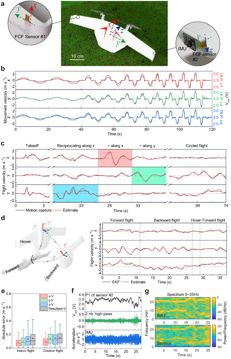 研究团队进一步将两个流速传感器装载到一个微小型无人机平台上进行飞行参数感知应用(图2)。结果表明平均飞行速度的估计误差低于0.2 m/s。由于流速传感器的高灵敏度特性,它甚至捕捉到了机翼的微振动信息,并与外置IMU模块显示了相同的机翼振动频率。这项研究展示了一种柔性高灵敏度流速传感器,拓宽了流场感知在微小型无人机姿态检测、空速估计以及飞行安全监测方面的应用,为无人机的飞行参数测量提供了创新的设计思路与发展前景。