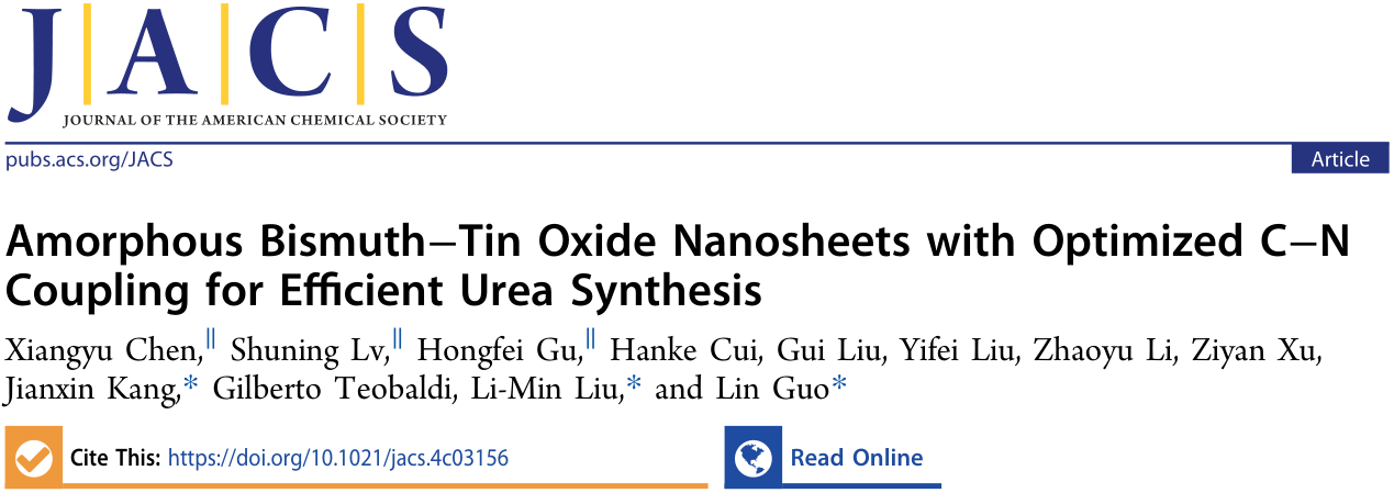 在国家自然科学基金项目(基金号:U1910208,52373221)等资助下,北京欧美大片ppt免费大全郭林教授、刘利民教授和康建新副教授研究团队在电催化尿素合成方面取得新进展。相关工作以“非晶氧化铋锡纳米片优化尿素合成中的C-N耦合过程(Amorphous Bismuth-Tin Oxide Nanosheets with Optimized C-NCoupling for Efficient Urea Synthesis)”为题,于2024年5月1日在《美国化学会志》(Journal of the American Chemical Society)杂志在线发表。化学学院博士生陈翔宇为文章的第一作者,物理学院博士生吕书宁和化学学院博士生谷鸿飞为共同第一作者。