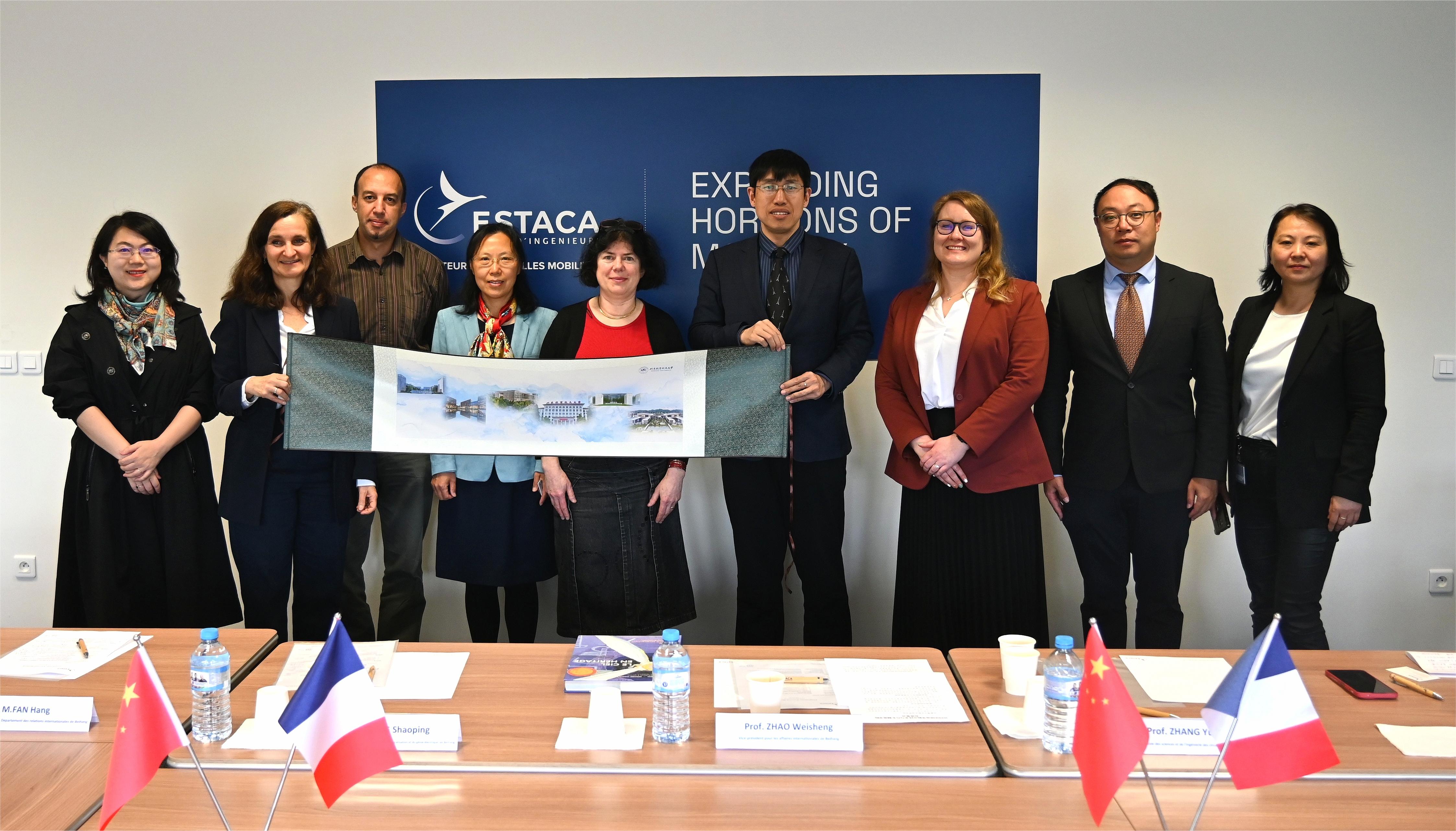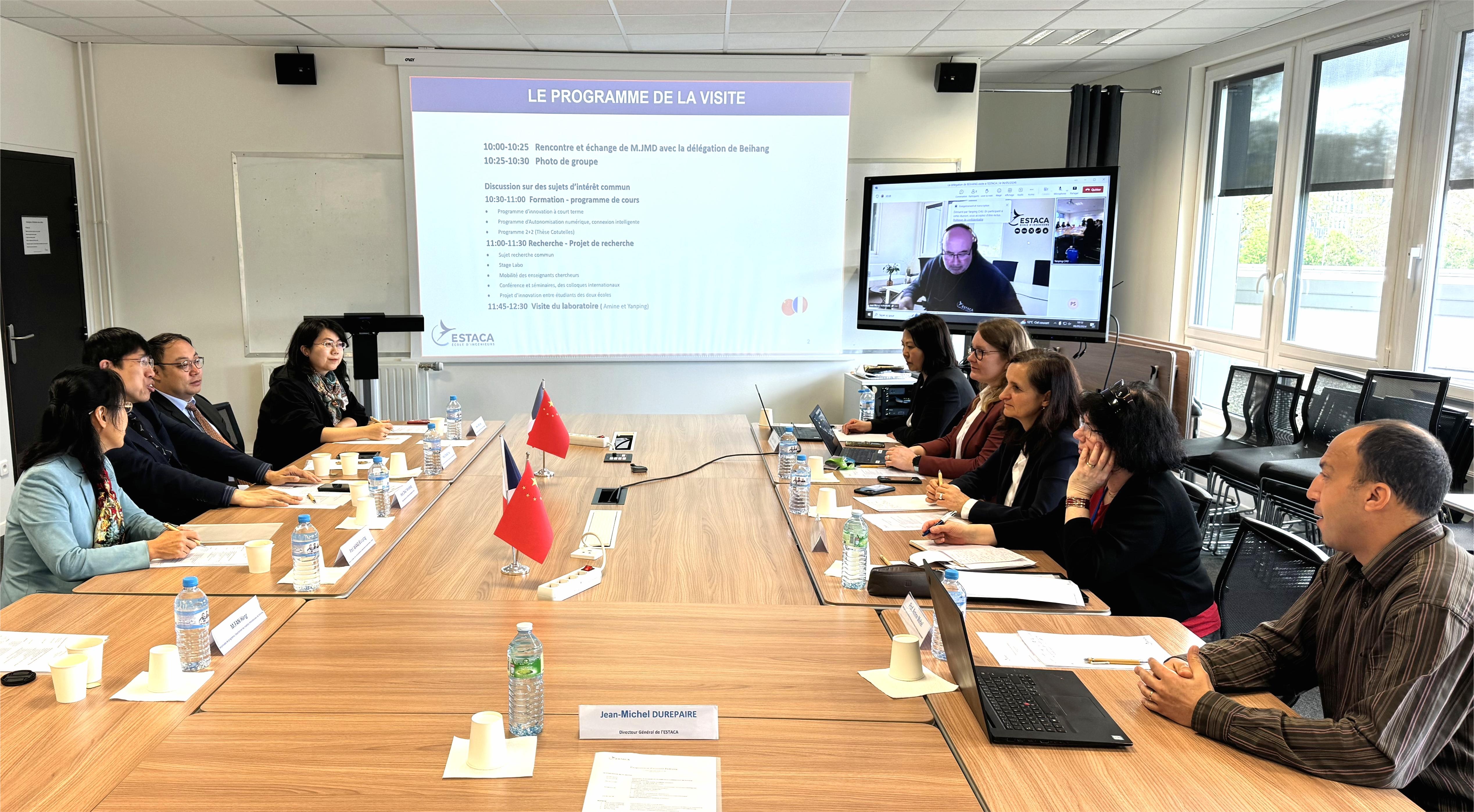 在法国高等航空技术与汽车制造学院(ESTACA),赵巍胜一行会见了ESTACA校长让-米歇尔·迪勒佩尔(Jean-Michel DUREPAIRE)、国际处负责人赫莲娜·梅尔塔宁(Henna MERTANEN)等。随后,双方就开展博士联合培养项目、科研合作、学生创新竞赛等议题进行深入研讨,达成多项共识。