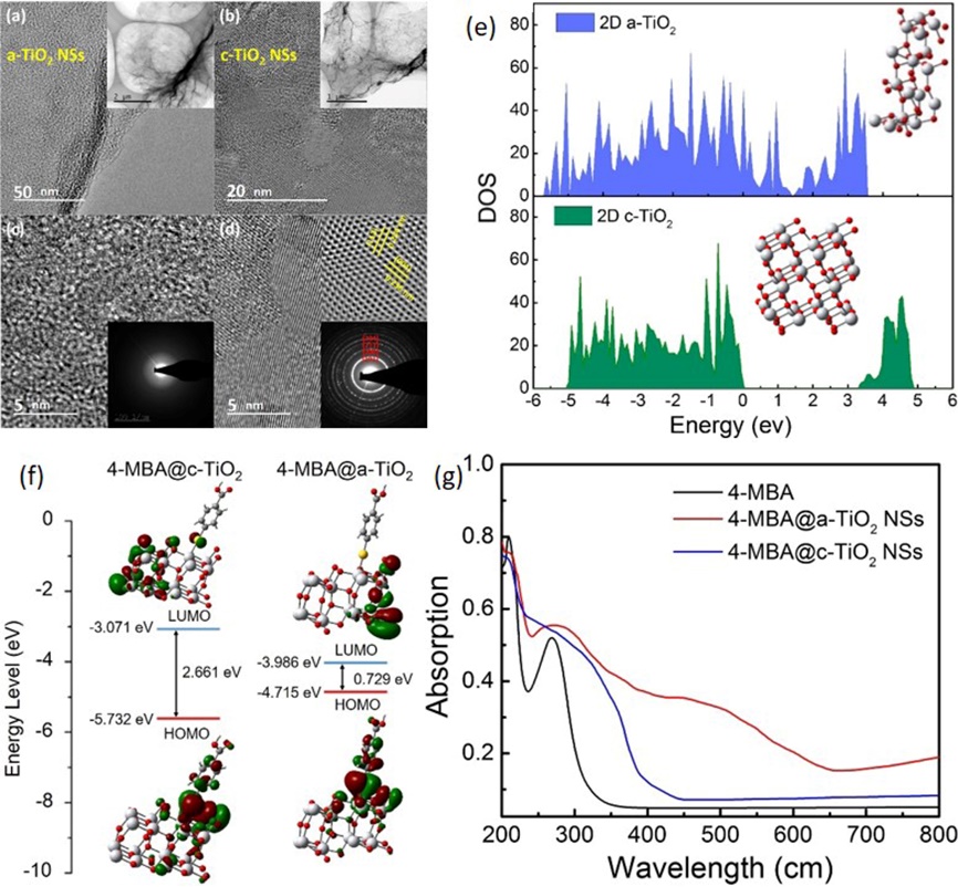 团队进一步发展了非晶化结构设计策略,利用二维纳米材料的表面原子处于高活性和低配位数有利于界面电荷转移的特性,设计了高SERS活性的二维非晶TiO2半导体基底。非晶化导致在二维TiO2的导带底和价带顶产生带尾,有效减小带隙,并保持导带和价带较高的态密度,从而实现非晶态二维TiO2基底与吸附分子间的显著光致电荷转移(PICT)(图3)(J. Am. Chem. Soc. 2019, 141, 5856-5862)。