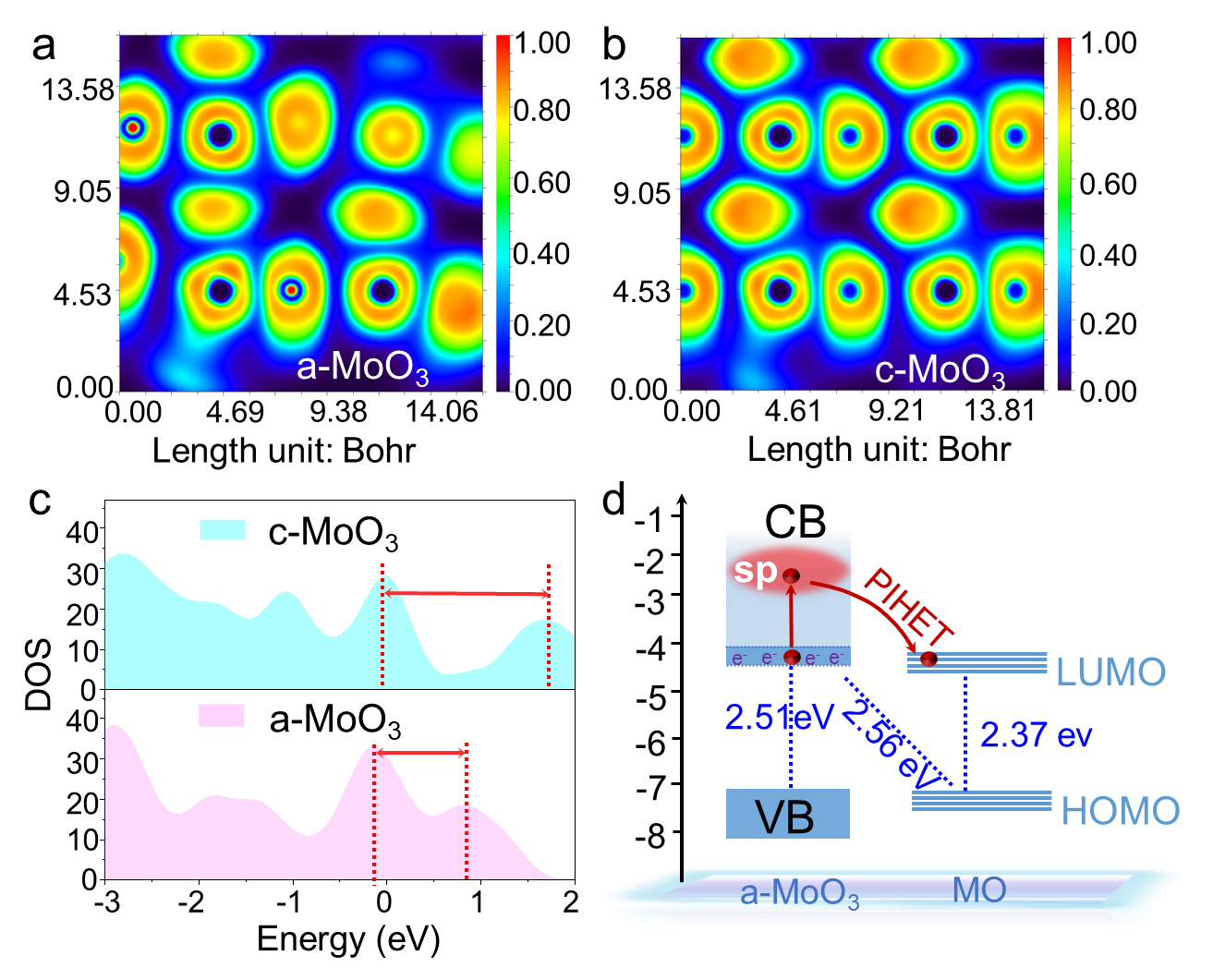 该团队针对SERS物理增强与化学增强之间的协同作用机制尚不明确的问题,设计了一种在可见光区具有等离子体共振效应(LSPR)的单层非晶MoO3纳米片,在单一的半导体基底中探究了LSPR与等离子体诱导的热电子转移(PIHET)之间的协同效应。由于非晶MoO3的无序结构中存在大量氧缺陷,导带底部Mo5+的4d轨道中累积了大量的自由电子,使其在可见光区域产生了明显的LSPR吸收,实现了在633 nm激光激发下的电磁场增强。此外,通过瞬态吸收光谱(TA)证明了非晶MoO3与MO分子之间存在PIHET效应。通过理论模拟证明非晶MoO3较晶体具有更高的电子离域性和电子态密度,更有利于界面热电子转移。提出在具有LSPR效应的非晶半导体中的EM-PIHET协同作用机制:等离子体共振向外辐射电磁场,产生电磁场增强效应;同时,等离子体共振可以诱导界面的热电子转移产生化学增强,进而实现电磁场-热电子转移的协同效应(图1)。利用该基底实现了多种致癌芳香胺分子的痕量检测与鉴别,对于降低癌症疾病接触风险具有重要的指导意义。研究工作揭示了非晶半导体中电磁场增强与热电子转移的协同作用机制,对非晶半导体的SERS增强机理分析及基底设计提供了有益的借鉴和指导。