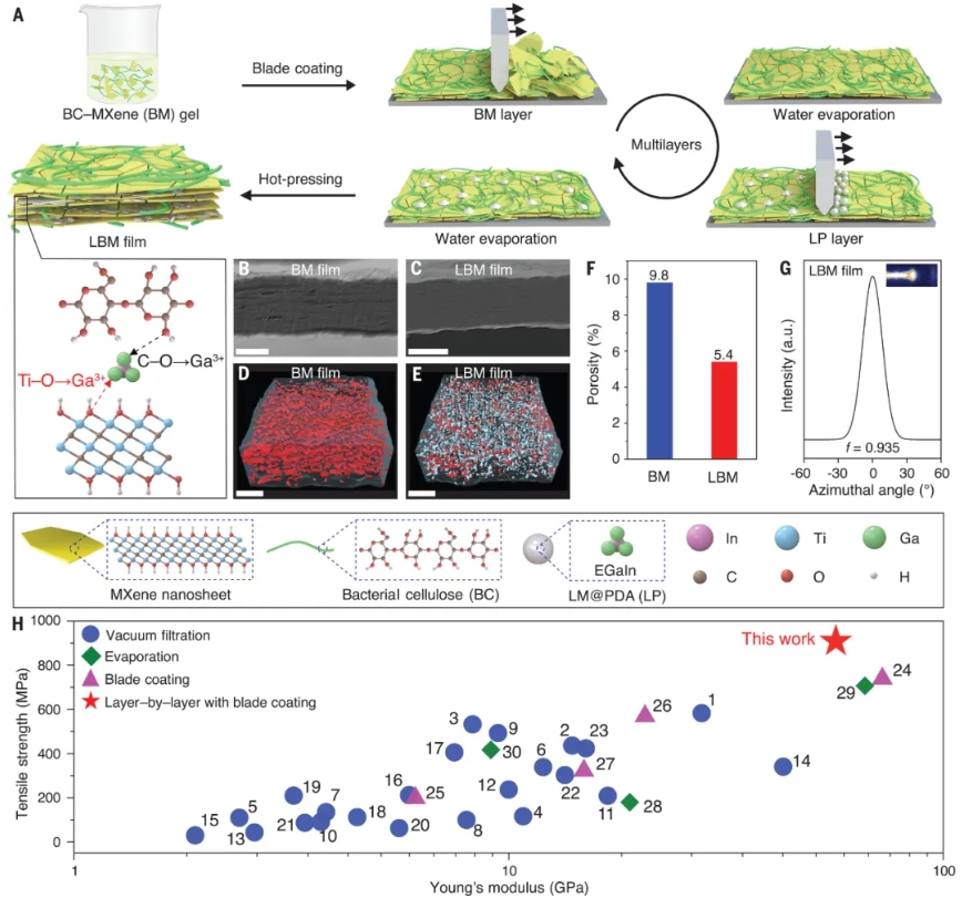 为了更有效地降低纳米复合材料的孔隙率,本工作创新性地开发了“层层组装”和“刮涂”相结合的策略。首先刮涂MXene纳米片和细菌纤维素(BC),然后刮涂聚多巴胺修饰的LM纳米颗粒(LP),在剪切力作用下LP发生变形并破裂,从而使得内部的LM流入到孔隙结构中,这种新组装策略可以实现逐层降低纳米复合材料的孔隙率(图1A-G)。同时,LM表面的三价镓离子(Ga3+)和MXene纳米片、BC分别形成了Ti-O→Ga3+和C-O→Ga3+配位键,大幅提高了载荷传递能力。制备的LM交联MXene复合薄膜(LBM)具有迄今为止最高的拉伸强度(908.4 MPa)(图1H)。