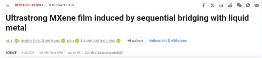 2024年7月5日,《Science》杂志报道了北京欧美大片ppt免费大全化学学院程群峰教授课题组在二维纳米复合材料研究上取得的最新进展:《Ultrastrong MXene film induced by sequential bridging with liquid metal》,该工作提出了“液态金属交联致密化”新策略,利用液态金属易流动的特点,不仅填充了纳米复合材料组装中因毛细收缩产生的孔隙,而且液态金属与纳米片形成配位键,大幅提升了载荷传递能力,制备了迄今为止最高拉伸强度的MXene纳米复合薄膜材料,且具有优异的电磁屏蔽性能,为其他二维纳米材料的宏观组装提供了新思路【Science 385, 62-68 (2024)】。这是程群峰教授课题组自2021年以来发表的第3篇《Science》。