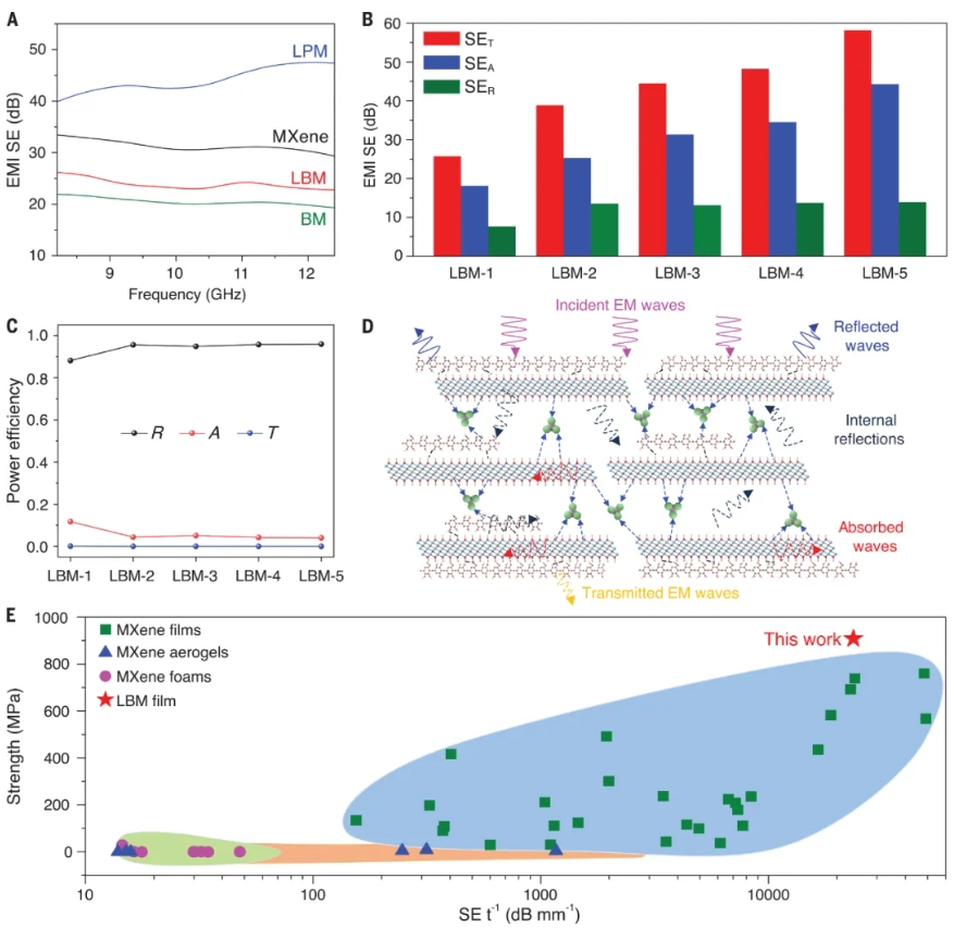 LM本身的高导电性赋予了LBM复合薄膜优异的电磁屏蔽性能,实现了二维纳米复合材料的结构功能一体化。相比于BM薄膜,LM交联LBM复合薄膜具有更高的电磁屏蔽性能(图4A)。在8.2GHz处,当薄膜厚度从1.1μm增加至15.2μm,LBM复合薄膜的电磁屏蔽性能从26.0 dB增加至58.2dB,超过了商用标准(20 dB)(图4B)。不同厚度下LBM复合薄膜功率效率R远大于A和T(图4C),因此LBM复合薄膜的电磁屏蔽机理以反射为主(图4D)。相比于其他MXene薄膜、MXene气凝胶和MXene泡沫,LBM复合薄膜不仅具有优异的力学性能还具有优异的电磁屏蔽性能(图4E),因而在航空航天和柔性电子器件领域,具有广阔的应用前景。本工作提出的“液态金属交联致密化”新策略,为其他高性能纳米复合材料的创制提供了新思路。