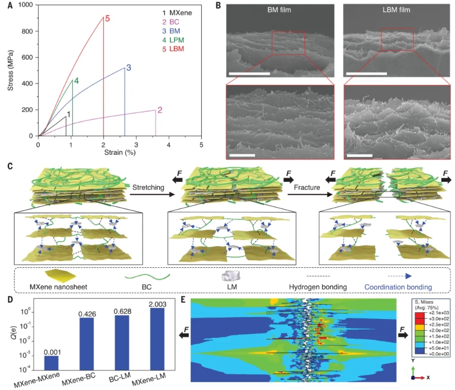 相比于纯MXene薄膜,LM交联LBM复合薄膜的力学拉伸强度达908.4±27.5 MPa、杨氏模量达56.6±2.5GPa、韧性达9.7±0.5MJ m-3(图3A)。相比于BC/LM(BM)薄膜,LBM复合薄膜呈现出锯齿状卷曲断裂边缘和整体阶梯状紧密排列的片层结构(图3B)。断裂机理图表明,LM和MXene间的强配位作用增强了MXene纳米片之间载荷传递能力(图3C),与DFT计算结果相吻合(图3D)。此外,有限元模拟宏观分析了LBM复合薄膜的断裂过程(图3E),结果表明加载后MXene纳米片之间会发生滑动,随着加载的进行,由于邻近的MXene纳米片的滑动,LBM复合薄膜发生了初始开裂,导致氢键的破坏。继续加载,BC和LM与MXene纳米片之间的配位键断裂,直到复合薄膜完全破坏。