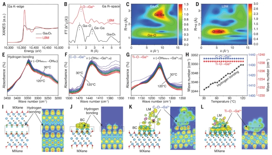 X射线光谱首次证实了MXene-LM和BC-LM之间均形成了Ga-O配位键(图2A-D)。变温傅里叶变换红外光谱结果进一步证明LBM薄膜中存在氢键和配位键作用,且配位键更加稳定(图2E-H)。密度泛函理论(DFT)模拟计算结果揭示了LBM薄膜中四种不同界面作用的强弱:MXene-MXene(弱氢键)< MXene-BC(氢键)< BC-LM(弱配位键)< MXene-LM(强配位键)(图2I-L),证实配位键显著提高了MXene纳米片间的载荷传递能力。