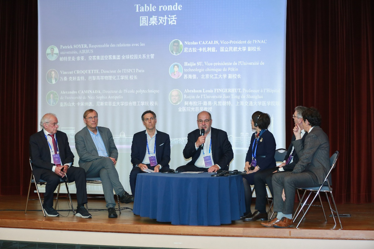 在论坛圆桌对话环节,法国空中客车集团全球校园关系主管帕特里克·索亚(Patrick SOYER)、巴黎高等物理化工学院校长万桑·克好盖特、尼斯索菲亚大学综合理工学院校长亚历山大·卡米纳达、法国国立民航大学副校长尼古拉·卡扎利兹(Nicolas CAZALIS)、北京化工大学副校长苏海佳、上海交通大学医学院瑞金医院光慈奖教授阿布拉汗·路易·凡哲胡特(Abraham Louis FINGERHUT)等中法教育界和产业界代表围绕会议主题展开对话。圆桌对话由法国技术科学院院士科赛主持。
