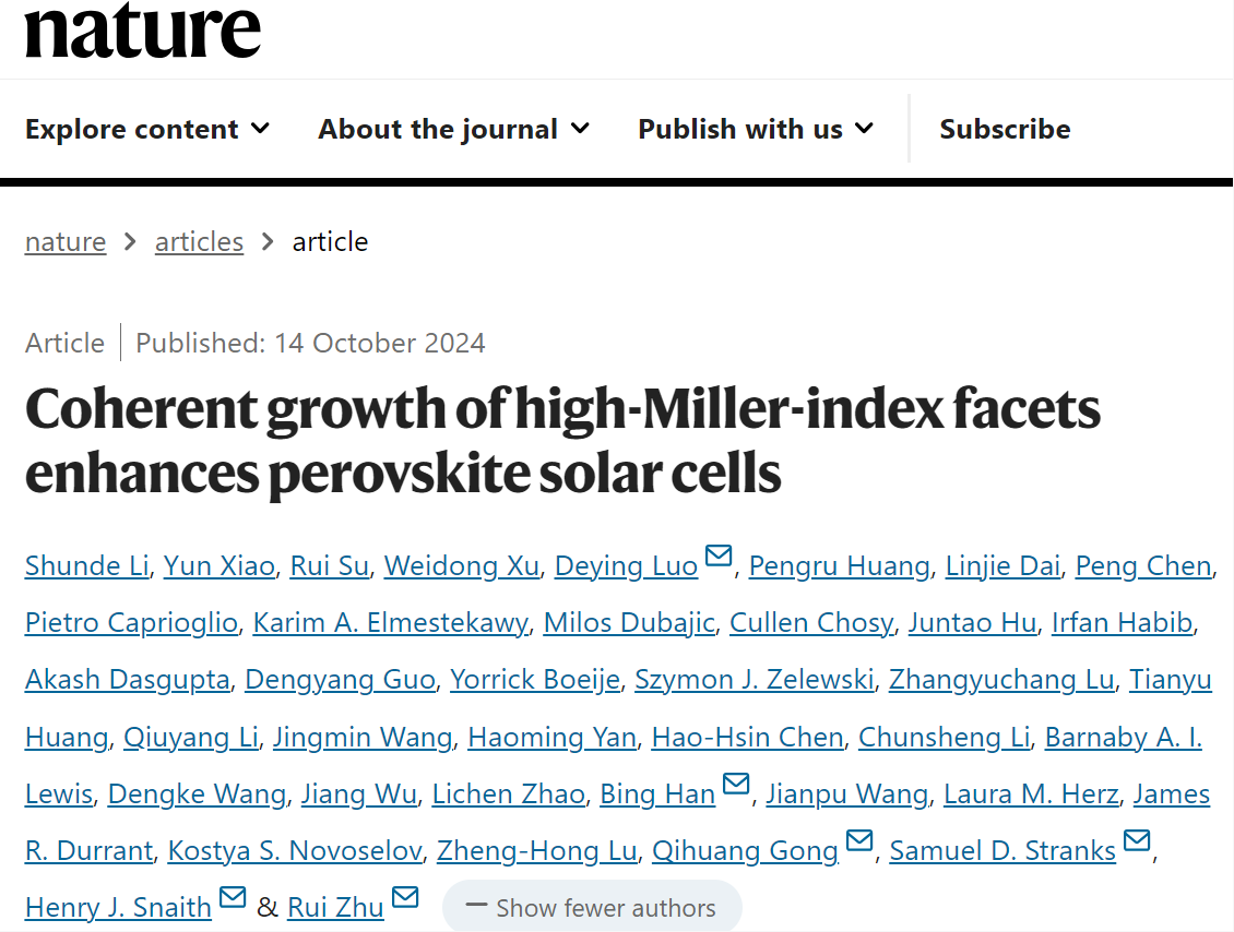 2024年10月14日,《Nature》报道了北航国际前沿交叉科学研究院罗德映教授和合作者在钙钛矿太阳能电池研究方面取得的最新进展:《Coherent growth of high-Miller-index facets enhances perovskite solar cells》。围绕反式钙钛矿太阳能电池面临“光子利用与电学损失”难以协同调控的关键技术挑战,该工作成功解密环境温度在钙钛矿半导体工艺中的重要作用,并基于此开发了能够实现钙钛矿微米级厚膜“光子利用与电学损失”协同调控的创新工艺技术,从而研制出高效稳定的反式钙钛矿太阳能电池。北航国际前沿交叉科学研究院罗德映教授、宁波东方理工大学韩兵助理教授、英国剑桥大学Samuel D. Stranks教授、英国牛津大学Henry J. Snaith院士、北京大学龚旗煌院士、北京大学朱瑞教授为通讯作者,北京欧美大片ppt免费大全为主要通讯单位之一。