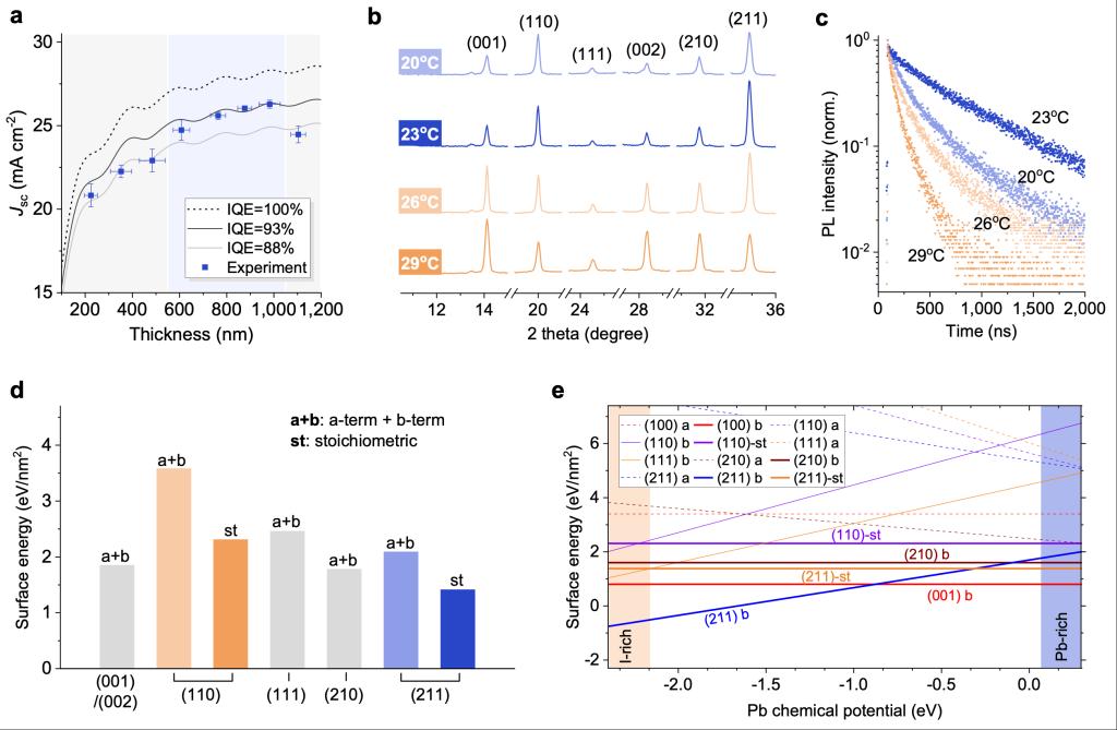 鉴于此,该研究首次报道了环境温度变化会导致巨大的薄膜光电性能差异(图1)。具体地,当环境温度低于室温时,制备的钙钛矿微米级厚膜呈现出最优的光电性能和高密勒指数(211)择优取向。密度泛函理论DFT计算发现(图1),高密勒指数的终端具有自发钝化能力,能够显著降低其表面间隙态。同时(211)晶面展现出较低的表面能和化学势依赖关系,还可以降低微米级厚膜中缺陷浓度。
