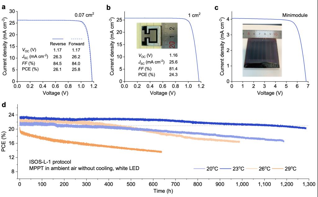 最后,该研究将高质量钙钛矿微米级厚膜作为光吸收层应用到反式器件中,成功把小面积器件效率提升至26.1%,大面积器件和小型模组效率分别高达24.3%和21.4%,并且显著提升了器件在光、热等外界条件下的工作稳定性(图3)。