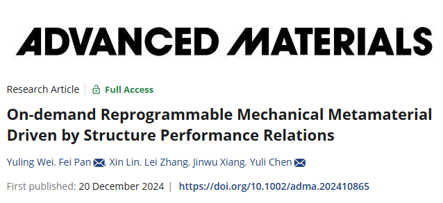 近日,《Advanced Materials》(先进材料)发表了我校航空学院潘飞副教授、陈玉丽教授与向锦武院士合作完成的研究成果“On-demand Reprogrammable Mechanical Metamaterial Driven by Structure Performance Relations”(构-性关联驱动的按需重编程力学超材料)。该工作利用“结构-驱动-调控”一体化的设计策略,实现了超材料力学性能的自动按需重定制,为迈向“物理智能+数字智能”融合的自适应人工智能系统提供了新的思路。该工作入选期刊“Editor’s Choice”,被特别推荐。航空学院博士生魏玉领是论文第一作者,潘飞副教授、陈玉丽教授是共同通讯作者。北京欧美大片ppt免费大全为第一单位。