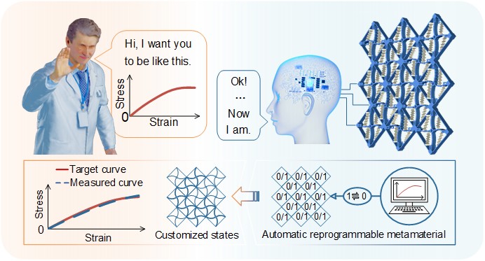随着人工智能的发展,多功能和自适应材料/结构的“物理智能”在具身智能体中发挥着重要作用,被认为是一种推动众多前沿领域发展的新兴范式。力学超材料,可凭借人工设计的微结构获得超越天然材料的优异性能,在加工完成后还能实现自身本构性能和结构形状的定制化调节,为自适应的物理系统提供了强大的设计平台。人们设想:未来的智能材料/结构能够融合物理智能和数字智能,通过数字接口对自身的性能进行主动、精确、快速的重编程,以响应人类命令或适应环境变化。然而,通过物理和数字智能的集成,实现对变化目标力学性能的快速自动重定制仍有待探索。