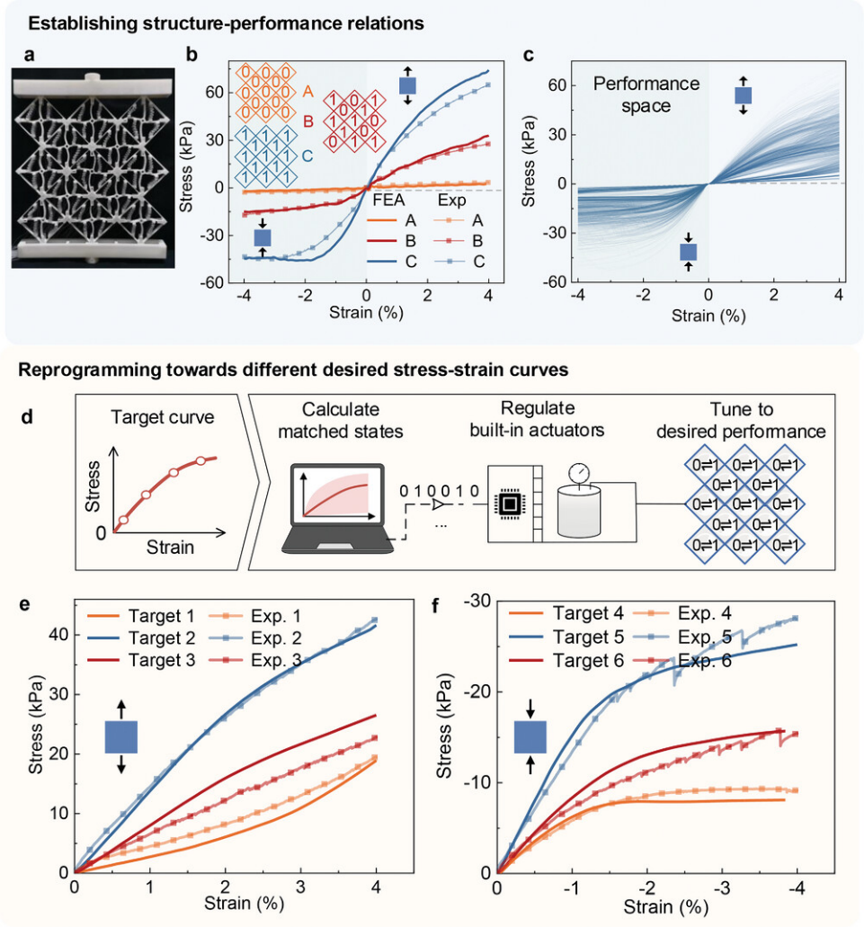 图1.根据目标应力-应变曲线自动重编程的力学超材料