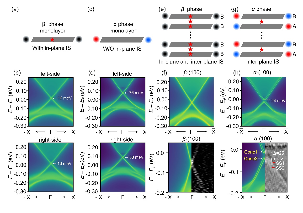 在本项工作中,研究团队发现在Bi4I4这个材料中,随着温度的下降存在结构相变,进而导致对称性降低,即自发对称性破缺现象。这种自发对称性破缺会导致单层的量子自旋霍尔绝缘体中原本简并的拓扑边界态变为非简并状态(如图c所示)。把这些具有非简并边界态的量子自旋霍尔绝缘体按照具有层间反演中心的形式进行范德华堆垛形成三维材料,非简并的边界态会沿着面外方向交替排列排列(图g),由于层间耦合作用,非简并的边界态会在能带相交处耦合打开能隙,进而产生有质量的狄拉克费米子。