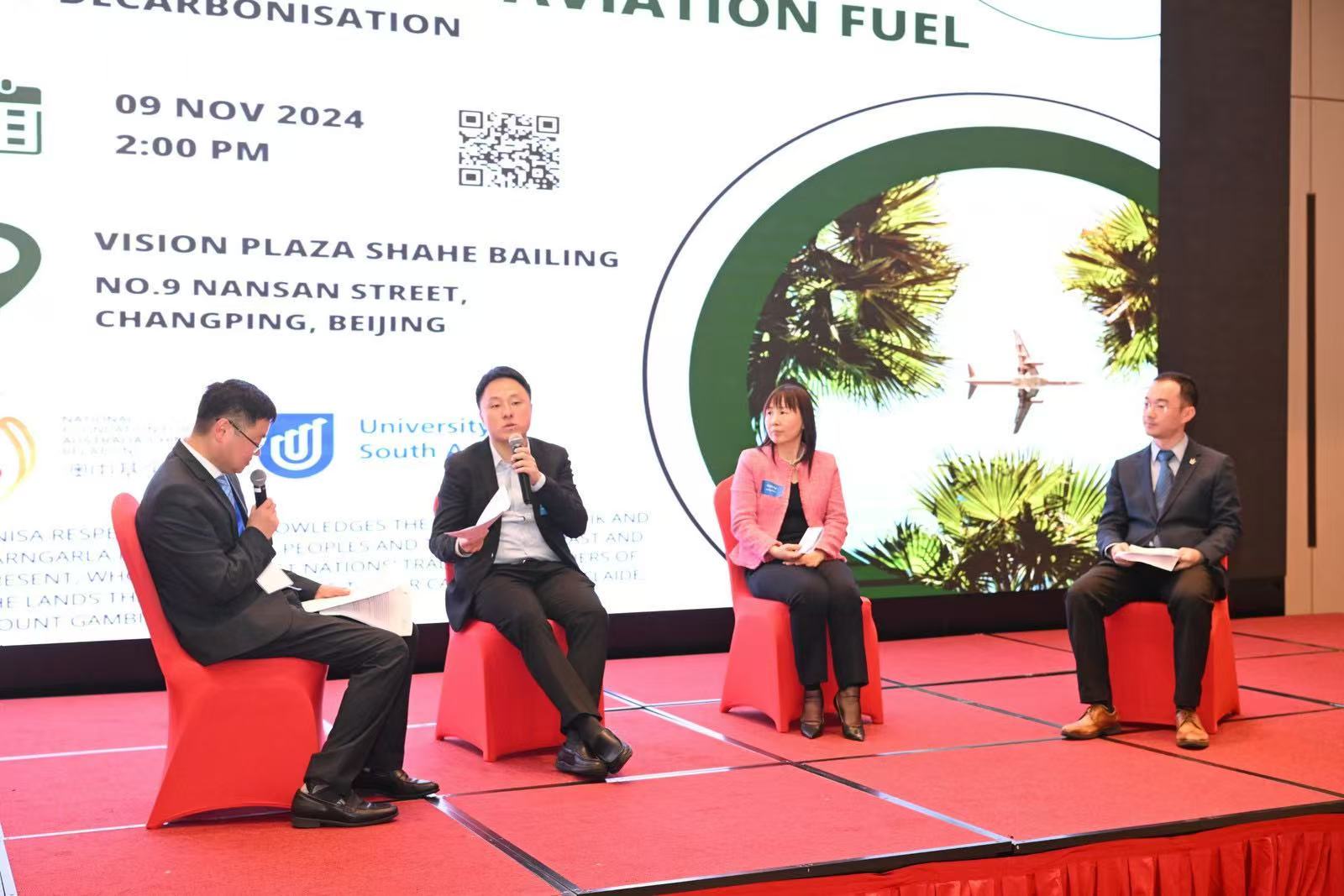 圆桌会议由南澳大利亚大学YahuaZhang教授主持,阿德莱德机场有限公司战略与可持续发展委员会主任PattyTherrios、波音(中国)公司可持续发展区域主管徐瑾瑾、空客中国可持续发展业务总监Rui Hou以及北京海新能源科技股份有限公司李耀光出席圆桌论坛,围绕“航空业脱碳”主题针对可持续发展航空燃料发展存在的机遇与挑战发表了精彩论点。