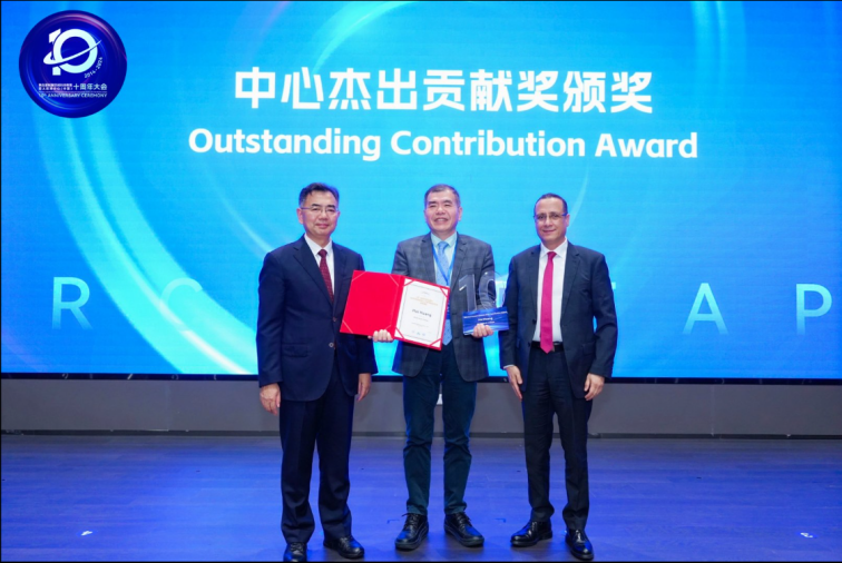 李国平和德里斯·埃尔·哈达尼为“亚太大学生小卫星项目”总设计师、北航宇航学院黄海教授颁发中心杰出贡献奖。