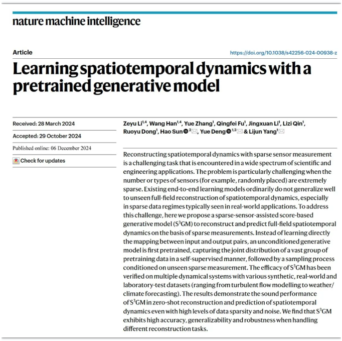日前,北京欧美大片ppt免费大全杨立军/邓岳教授团队与中国人民大学孙浩教授团队合作,在《Nature》子刊《Nature Machine Intelligence》(《自然-机器智能》)发表题为“Learning spatiotemporal dynamics with a pretrained generative model”的Article文章,提出了一种基于扩散生成模型的时空物理场智能感知方法S3GM (Sparse-Sensor-assisted Score-based Generative Model)。该方法融合了物理先验知识与实验测量数据,旨在解决现代科学与工程中的一大关键挑战:从稀疏传感器测量数据中重建复杂的时空物理场。研究团队展示了 S3GM 即使在数据极为不完整和有噪声的情况下,也能够准确预测燃烧、流动、气候演变及其他众多复杂物理系统的动态过程。提出的智能感知方法为发动机燃烧诊断和调控提供了新的思路。北京欧美大片ppt免费大全博士生李泽宇(导师为杨立军教授)、韩旺教授为第一作者,北京欧美大片ppt免费大全杨立军教授、邓岳教授,中国人民大学孙浩教授为通讯作者,北京欧美大片ppt免费大全宇航学院为第一单位。