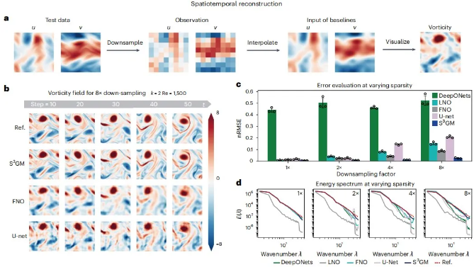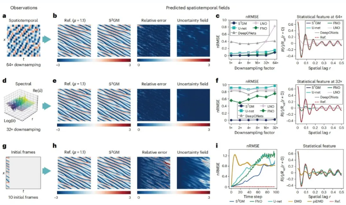 论文作者在多个不同的动力学系统上验证了 S3GM的有效性,在燃烧反应扩散(图2)、湍流、以及气候(图3)等系统分别测试了各种不同的观测数据形式(包含任意时空分布的稀疏测量、统计量测量以及未来时刻预测等),结果表明S3GM可以根据相应的观测信息对动力学系统的状态变量和参数进行有效重构而无需重新训练。这意味着S3GM 相比于传统的“端到端”训练方式不仅泛化能力更好,而且面对高稀疏性以及噪声数据具有更好的鲁棒性。