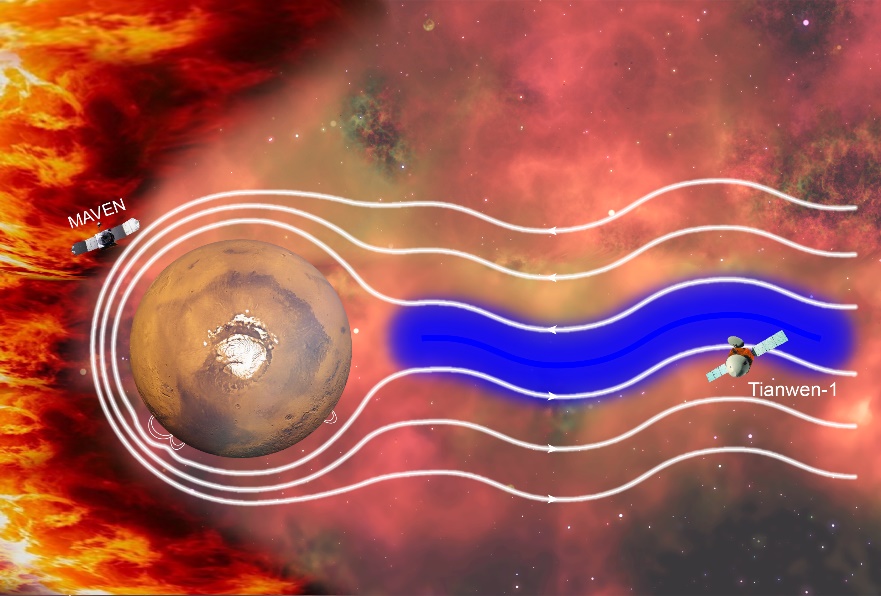 在太阳系中,火星因其与地球的诸多相似性,成为人类探索生命起源和行星演化的首选目标。火星没有内禀磁场,只有局部的地壳剩磁。太阳风与火星相互作用,能驱动火星的快速演化。披挂在火星日侧的行星际磁力线,其两端朝着太阳反方向延伸,在火星夜侧形成磁尾。火星磁尾高度依赖于太阳风条件,因而变得极其活跃和敏感。然而,由于以往单航天器观测的局限性,太阳风和火星磁尾之间的相互作用至今仍是一个开放的科学问题。
