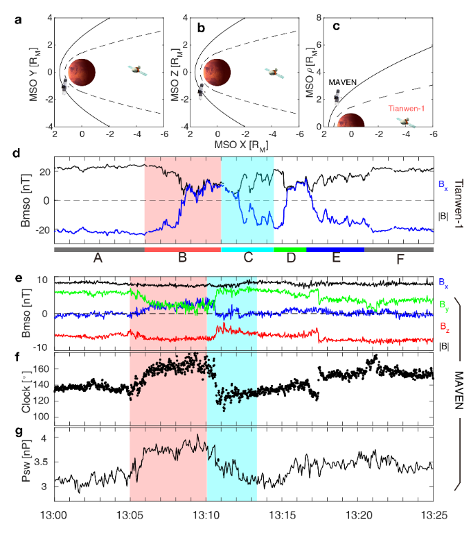 在此项工作中,“天问一号”环绕器位于火星远磁尾区域,MAVEN卫星在火星上游的太阳中,通过对“天问一号”和MAVEN卫星在不同区域的同时观测进行研究(如图2所示),研究人员发现太阳风动压增加和行星际磁场偏转都能够导致火星磁尾发生摆动。通过互相关分析,研究人员进一步发现火星磁尾电流片拍动和太阳风扰动的时间差大约为2-3分钟。