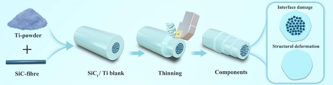 连续碳化硅纤维增强钛基复合材料(SiCf/Ti)具有高比强度、高比刚度、耐腐蚀、耐高温、抗疲劳等优异性能,这些属性使其在航空、航天、汽车和核能等工业领域的应用范围越来越广。该材料在延性Ti基体中添加高强度、坚硬的脆性SiC纤维为材料提供了卓越的性能,但两相之间性能的巨大差异对SiCf/Ti部件的成型和加工提出了重大挑战。SiCf/Ti的主要优点是通过加入连续的SiC纤维来增强轴向拉伸强度,这使得优异的轴向强度成为其最大的性能优势。因此,在SiCf/Ti组件生产的整个生命周期中,轴向尺寸通常在坯料制备阶段是固定的,随后的加工旨在减少外部Ti基体的厚度而不损坏纤维。与传统加工垂直于纤维的端面相比,减薄金属外层是SiCf/Ti零件加工中的关键环节。然而,过大的加工应力和显著的亚表面变形经常导致纤维和基体之间的开裂,在严重的情况下,在表面下甚至发生广泛的纤维断裂,通常就会采用保守的加工参数来保证质量,这限制了整体加工效率。以上加工难题对减薄SiCf/Ti复合材料的高效和低应力加工提出需求。