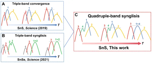 图2. 四能带协同示意图:三能带收敛和三能带合并的协同