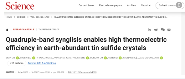 2025年1月10日,国际顶级期刊《Science》报道了北航赵立东课题组在高储量、低成本、宽带隙热电材料及器件研究领域取得的最新进展:《Quadruple-Band Synglisis Enables High Thermoelectric Efficiency in Earth-Abundant Tin Sulfide Crystals》,该工作在硫化锡(SnS)晶体中发现和调控了四个价带在能量和动量空间的协同效应(Quadruple-Band Synglisis),在P型SnS晶体中实现了~48K的制冷温差及~6.5%的发电效率。通常认为能带间隙在Eg≈6-10 kBT(kB为玻尔兹曼常数)范围内的材料为理想的制冷材料(Goldsmid, et al. Thermoelectric Refrigeration,Springer, 1964.),该工作表明带隙Eg宽达46 kBT的SnS也可作为热电制冷材料【Science 387 (2025) 202-208】。博士生刘姗为第一作者,卓越师资博士后秦炳超、常诚教授、赵立东教授为通讯作者,北京欧美大片ppt免费大全为第一单位。这是赵立东教授课题组自2015年以来发表的第11篇《Science》。