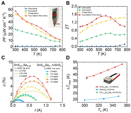基于四价带协同效应优化后获得的宽带隙P型SnS晶体,其器件制备表现出优异的热电转换效率。如图3C所示,单臂器件在温差ΔT为480 K时,可实现~6.5%的发电效率。搭配N型商用碲化铋的热电制冷器件在热端温度为353 K时,可实现~48.4 K的最大制冷温差ΔTmax(图3D)。该研究工作表明储量丰富、成本低廉、环境友好的SnS在温差发电和热电制冷领域具有广泛的应用前景。