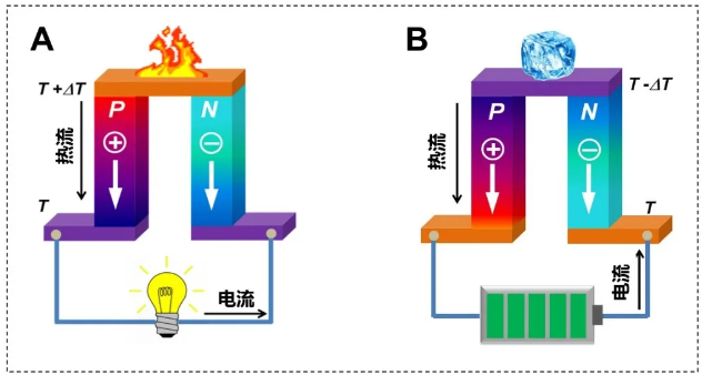 图1. 热电效应:(A) 塞贝克温差发电示意图;(B) 珀尔帖热电制冷示意图