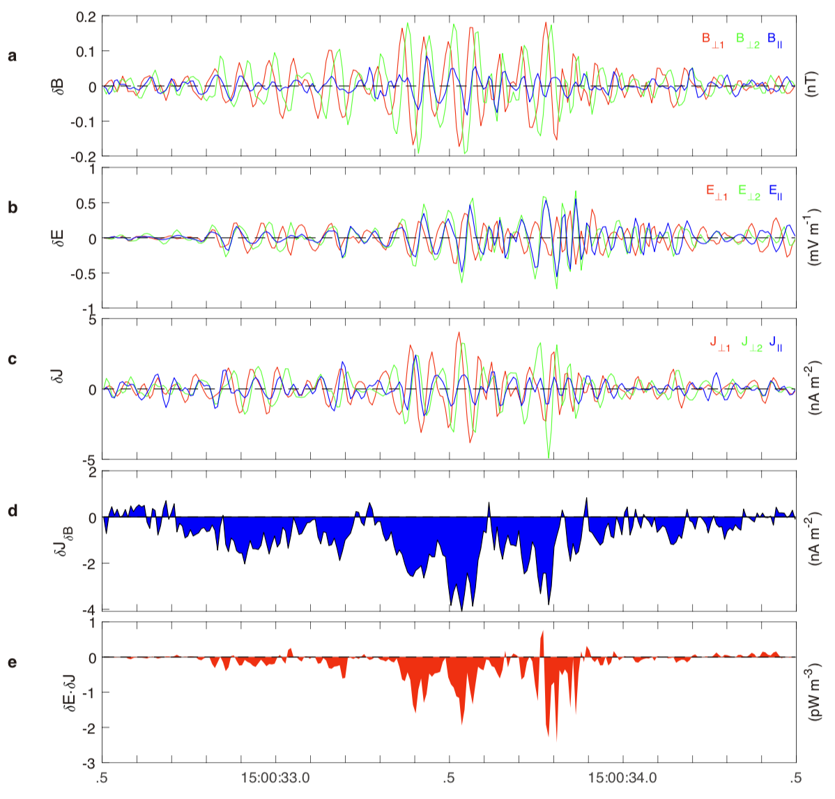 空间与地球科学学院曹晋滨教授领导的空间科学团队长期从事地球空间等离子体电磁波动和波粒相互作用研究,具有扎实的理论基础和丰富的卫星观测数据经验,取得了多项具有国际影响力重要成果。团队成员刘成明副教授等人在对合声波非线性理论进行深入研究后,认为合声波的产生是一个基本空间等离子体物理过程,不仅在传统观点认为的近地空间偶极磁场区域存在,在非偶极磁场区域,也应该存在。在对国际地球磁层多尺度卫星MMS(Magnetospheric Multiscale Mission)海量数据分析后,首次在非偶极场结构的磁尾中性片区域发现了连续出现的合声波(图2),证明了新观点。磁尾中性片区域磁场极为微弱,仅为地球表面磁场的万分之一的量级,其拓扑结构也与偶极场完全不同,在传统合声波理论框架下,那里不应该存在合声波。这一新发现打破了学术界关于合声波只能在地球偶极磁场控制的近地区域出现这一持续70多年的传统观点。