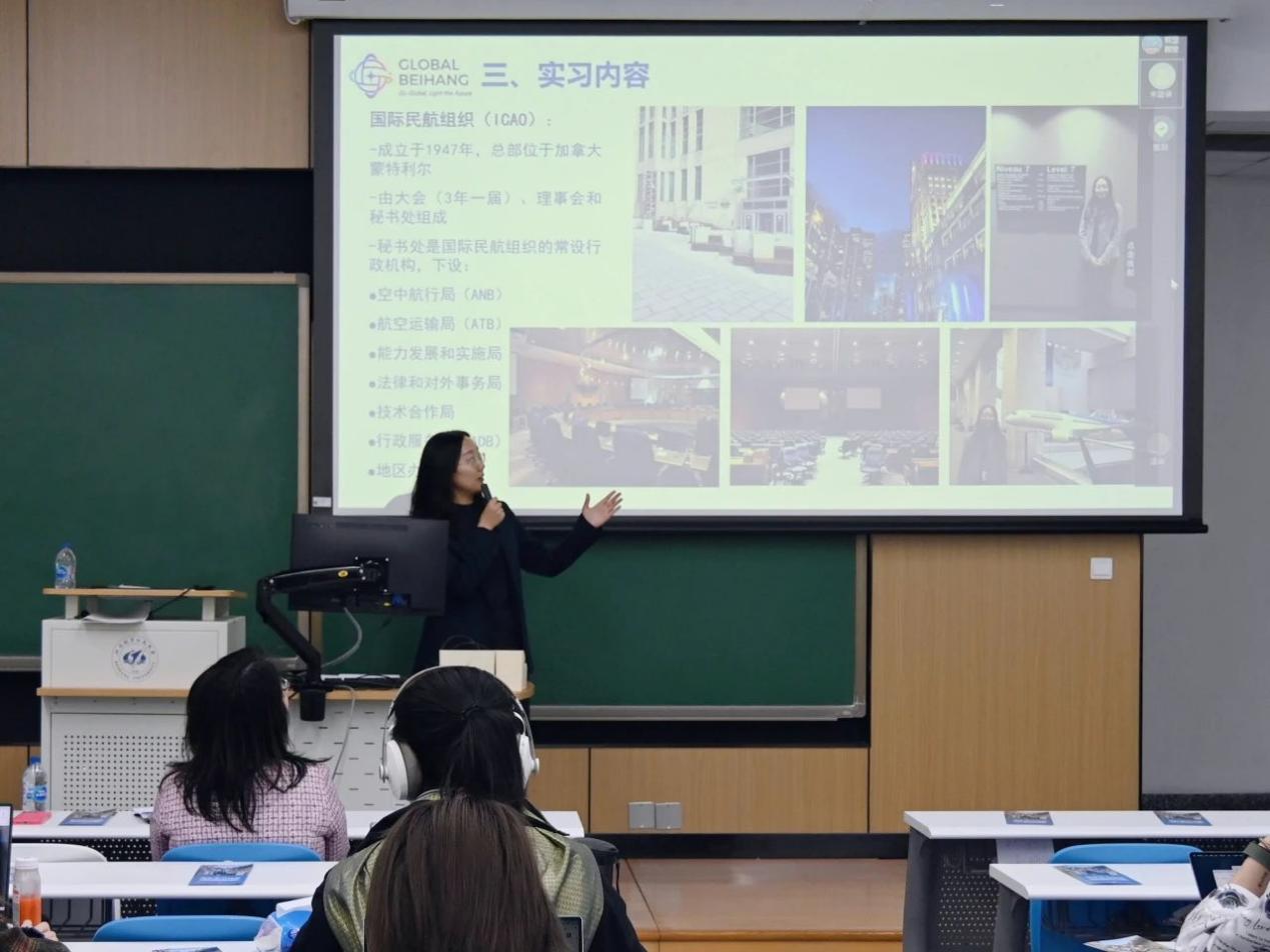 贾语扬老师从实习申请、工作内容、跨文化适应等多个维度展开分享。她说,国际民航组织的实习不仅要求扎实的专业背景,更需要快速适应国际化工作环境的能力。在加拿大蒙特利尔实习期间,她参与了航空安全数据分析、国际标准文件修订等工作,实习工作使她深刻体会到全球航空治理的复杂性和协作性。此外,她强调了跨文化交流的重要性,认为在国际组织工作不仅是专业能力的提升,更是思维方式和全球视野的拓展。