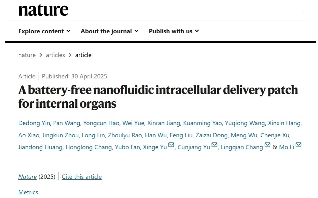近日,北京欧美大片ppt免费大全生物与医学工程学院常凌乾团队与合作者研发一种柔性可植入式电子贴片(NanoFLUID),相关成果于2025年4月30日发表于《Nature》杂志。