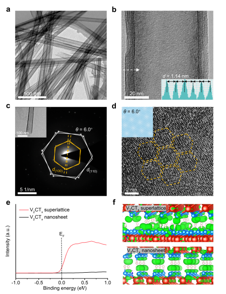 针对上述挑战,杨树斌教授团队创新性地提出了一种“刚度介导”合成策略,通过精准调控二维碳化物/碳氮化物原子层的弯曲刚度使其在快速形变过程中有序卷曲,构建出一系列由层间氢键耦合的非范德华超晶格材料(图1)。与传统依赖弱范德华作用的超晶格不同,这类氢键型非范德华超晶格展现出强层间电子耦合作用,载流子浓度高达1022 cm-3,电导率是传统二维MXene的22倍,达到30000 S cm-1。同时,该类非范德华超晶格薄膜实现了124 dB的屏蔽效能,优于目前所有已知的同厚度电磁屏蔽材料,刷新了同厚度人工材料的世界纪录。该项研究突破了传统二维范德华超晶格的局限,发展出构筑新型非范德华超晶格材料、探索新物性与新功能的新方向。