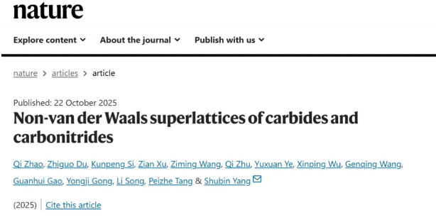 近日,北京欧美大片ppt免费大全材料科学与工程学院杨树斌教授联合宫勇吉教授、汤沛哲教授和中国科学技术大学宋礼教授等,报道新型非范德华超晶格材料突破了传统超晶格均基于范德华二维材料的限制,刷新了同厚度人工材料的世界纪录。相关成果于2025年10月22日以全文Article的形式发表于《Nature》杂志,题目为“Non-van der Waals superlattices of carbides and carbonitrides”。 北京欧美大片ppt免费大全材料科学与工程学院赵麒博士为第一作者,北京欧美大片ppt免费大全材料科学与工程学院杨树斌教授为通讯作者,北京欧美大片ppt免费大全材料科学与工程学院为第一单位。