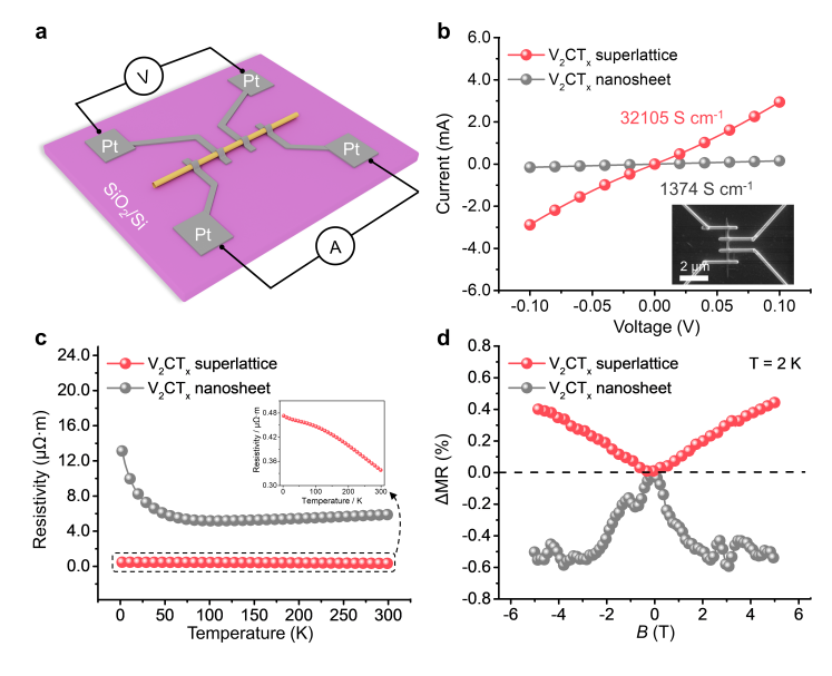 ●材料体系突破:传统人工超晶格以二维范德华材料为基本构筑单元,依靠层间较弱的范德华作用力实现组装,导致其层间调控能量低,易受环境热扰动和结构无序性的影响。该新型非范德华超晶格通过氢键实现层间耦合,在层间构建了导电网络通道,从而赋予材料以强电子耦合特性(图2)。该类非范德华超晶格材料有效突破了传统二维范德华超晶格体系的固有局限,为探索新物性与开发新功能提供了全新的材料平台。